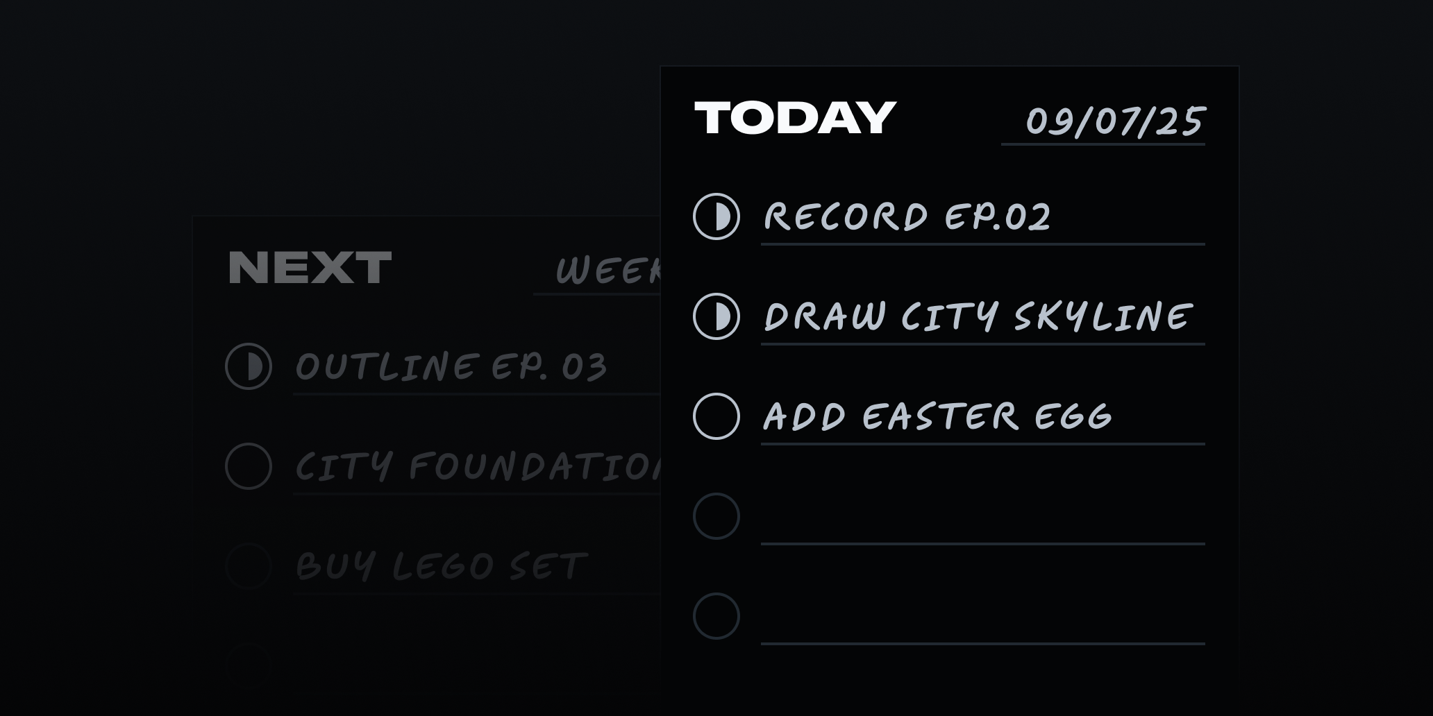 The 3-dot system at the top of each card? I use it as a simple challenge. One dot for personal projects. Two dots for Linear work. Three dots means I completed everything. It’s a small game, but it works for me.