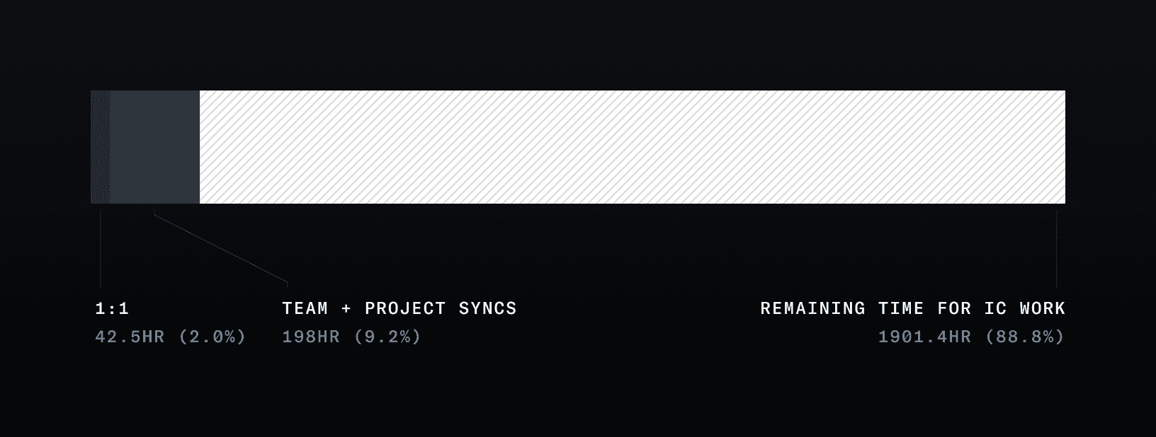 Structurally unchanged, 90% of my time is dedicated to IC work (Google Calendar's insights say 88.8%). My weekly meetings are: