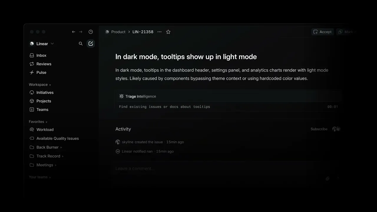 First, generating summaries that don’t feel like slop at all isn’t a fully solved equation in 2025. As a result, something more complex like suggesting an appropriate team, project, assignee, or label felt like a challenge. Trust is probably the keyword here because, even if Linear managed to build some over the years, how can you possibly tell if the suggestion is worth opening or not at first glance? Reasoning tooltips were our answers to this, with providing alternatives as well. We went over design and implementation details in a dedicated article with Matthijs Wolting (Engineer) if you want to learn more.