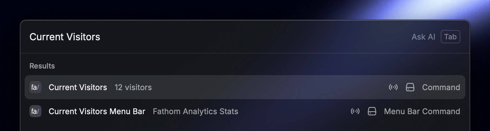 Browse your website analytics directly within a few keystrokes: live count of visitors, pageviews, referrers, browsers, devices, and countries.